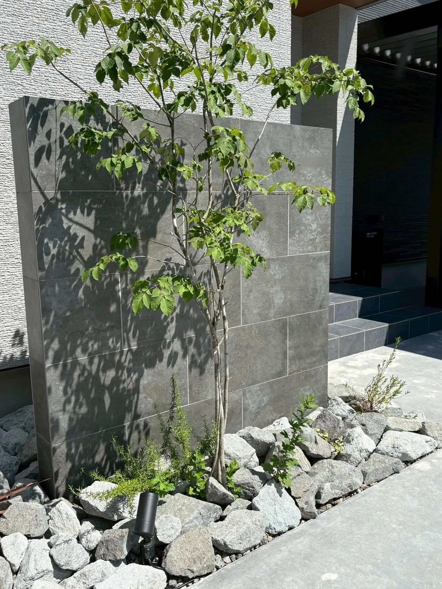 玄関前のタイル門柱☀️ 2025/08/09 玄関前のタイル門柱☀️ 300×600のタイル タカショーのセラレバンテを使用しています🎶 かっこいい雰囲気にとても合う商品です! アオダモやロックガーデンでより素敵な花壇となっています✨ 夜は照明もつくので、さらにかっこよさが際立ちますね😎