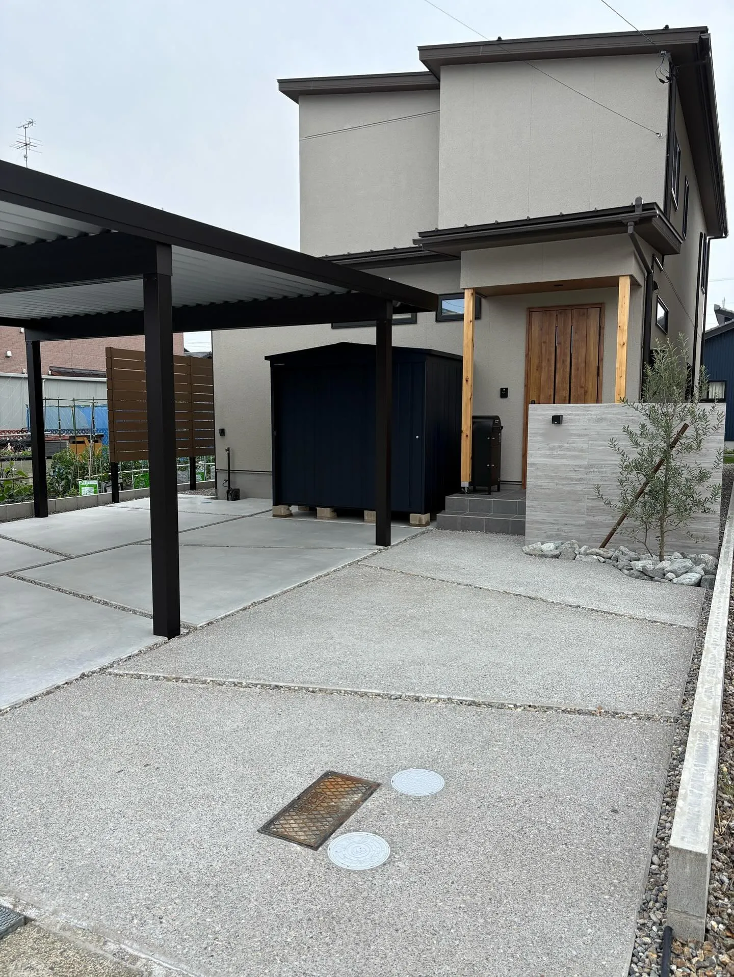 コンクリート洗い出しのアプローチ施工例☀️ 2025/11/21 コンクリート洗い出しのアプローチ施工例☀️ 斜めのスリットもおしゃれですね♪ タイル門柱のタイルはタカショーのセラウォールを使用しています! オリーブとの相性もばっちりですね!