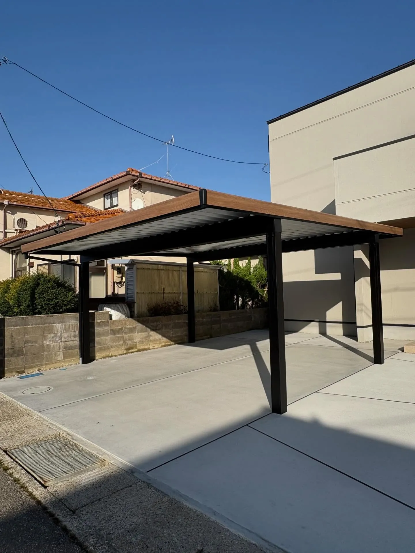 2台用カーポートを設置しました✨ 2025/11/28 2台用カーポートを設置しました✨ カーポートの鼻隠しを建物の軒下の色に合わせて木調にしています! ちょっとしたこだわりが、とてもおしゃれに見せてくれますね☺️ 外構に少しアクセントを加えたい方にはオススメです🌱