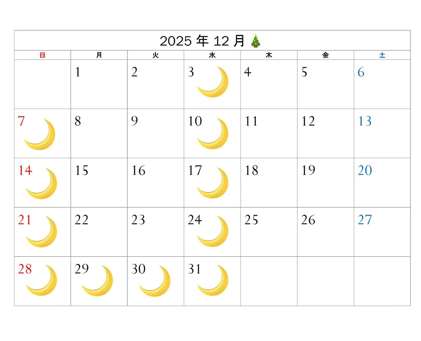 🌙マークの日曜日、祝日、水曜日は定休日となります。